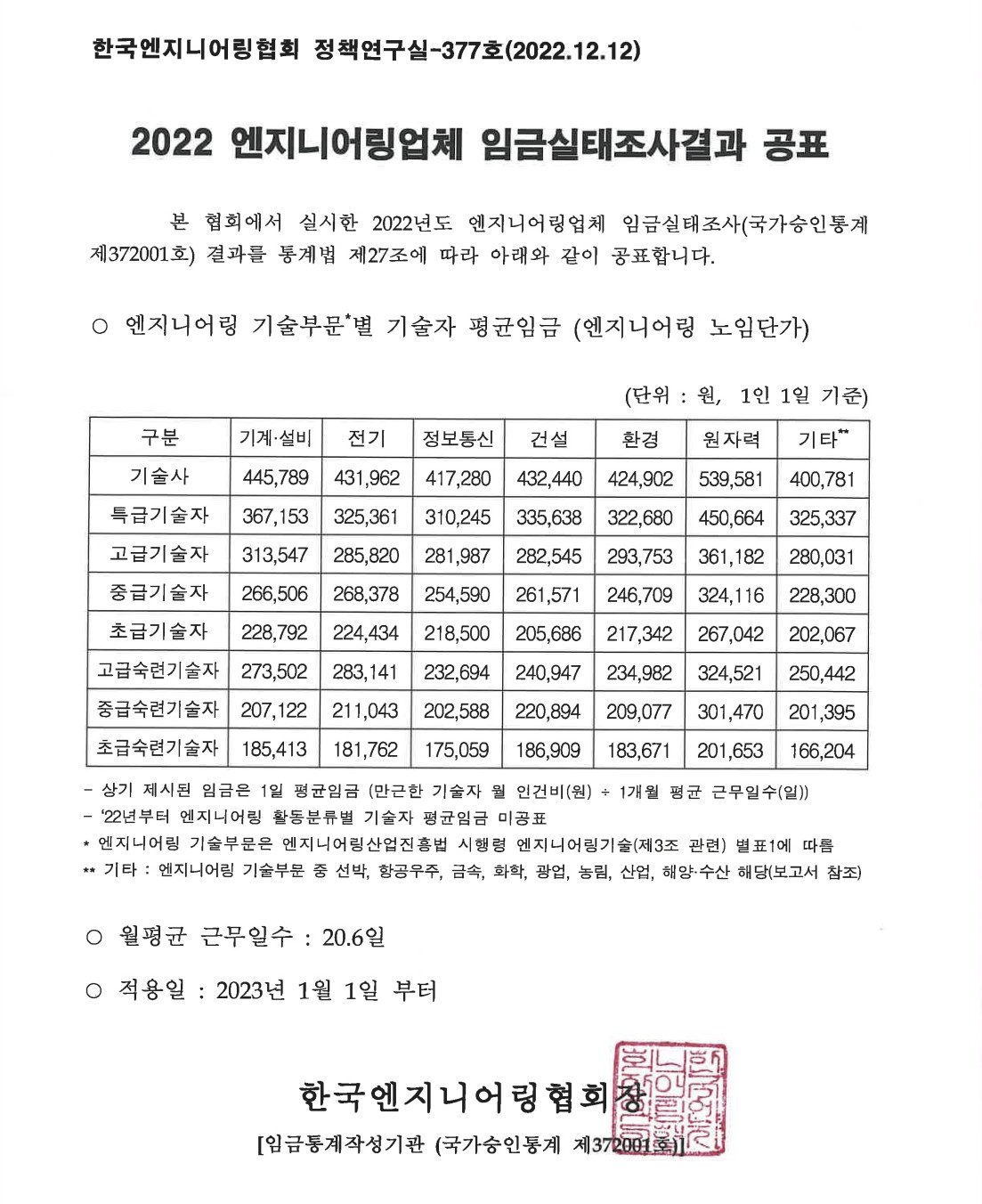 2023년 엔지니어링 노임단가가 2022년 12월 13일자로 공고되었습니다.
