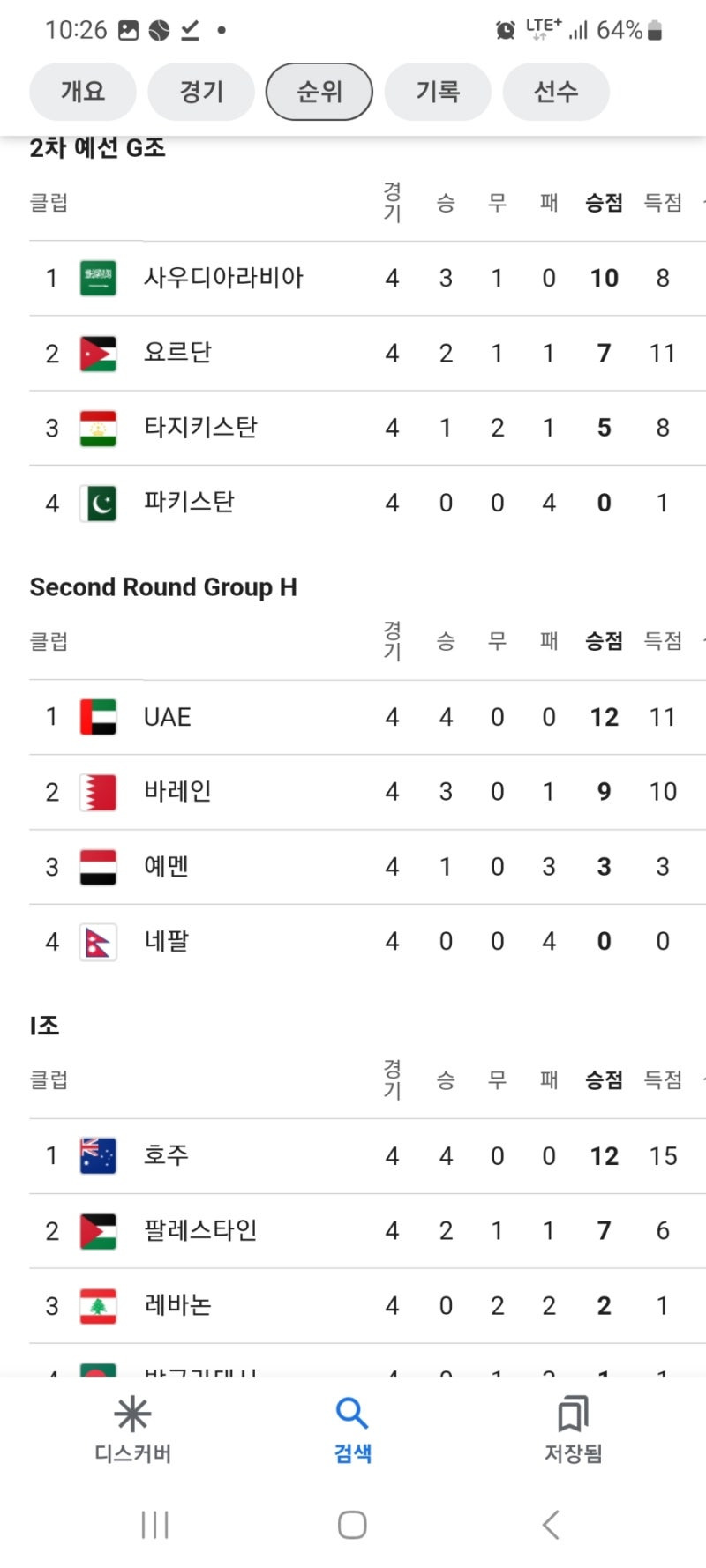 - B조 : 대한민국이 현재 1위를 차지하고 있으며, 이라크가 2위에 올라있어요.
