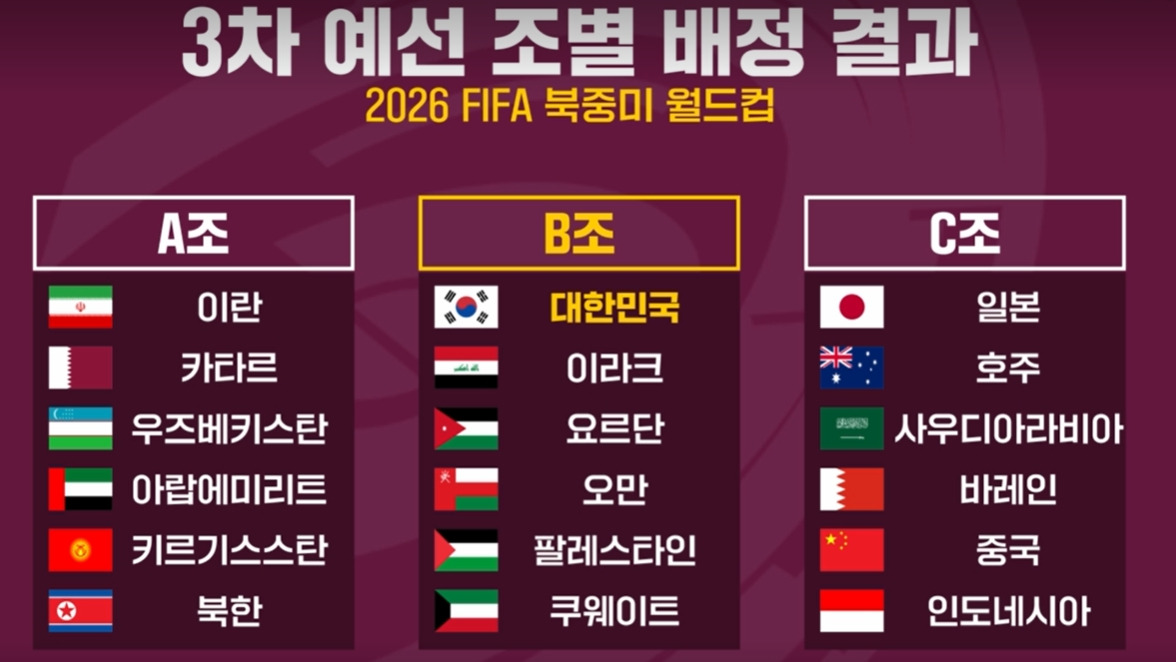 [3] Wikipedia - 2026년 FIFA 월드컵 아시아 지역 3차 예선 (https://ko.wikipedia.org/wiki/2026%EB%85%84_FIFA_%EC%9B%94%EB%93%9C%EC%BB%B5_%EC%95%84%EC%8B%9C%EC%95%84_%EC%A7%80%EC%97%AD_3%EC%B0%A8_%EC%98%88%EC%84%A0)